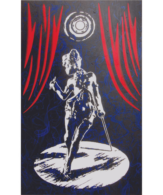 Plato the goat. Between heaven and hell. 1988-2011 Acrylic on canvas 1200 x 2000 mm This goat was an actor in the film Rio Turvo, directed by Edgar Pêra, where I participated in the decoration team. His character dies. His horns remain on the coffin. Now on the head of this spectral figure, in this final and perpetual representation. This is the painting made from the sculpture of this character (2006).